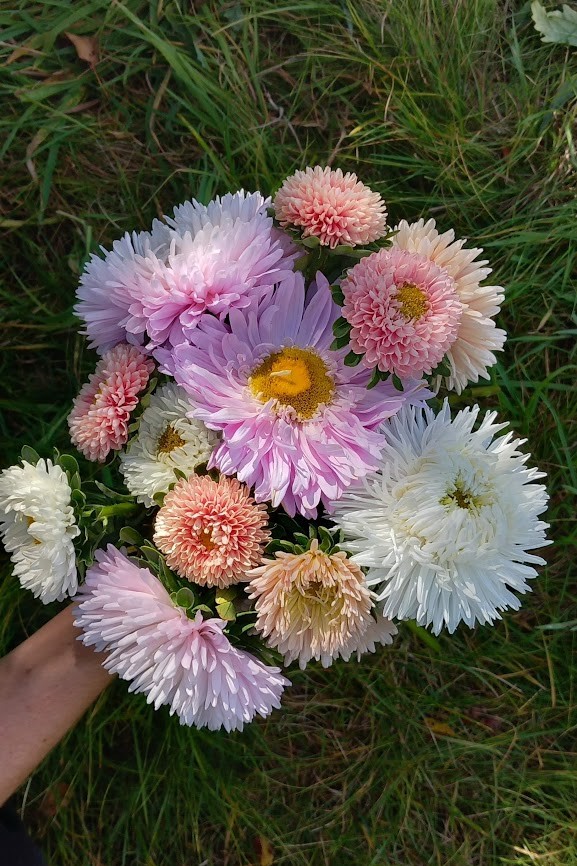 Sommaraster The Roses Mixture är utmärkt som snittblomma.Ettårig.En blandning i aprikos, ljusrosa, ljuslila och vita nyanser.Blommorna är både enklare och dubbla, vissa stora, andra små.Omtyckt av pollinerare.Lång blomningstid och frosttålig.Höjd ca 40-70cm.Trivs i mullhaltig och välgödslad, gärna sandblandad jord i öppet och soligt läge.