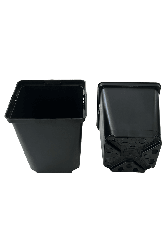 Fyrkantiga ganska tunna men ändå mycket starka, svarta plastkrukor.Kan återanvändas många gånger.